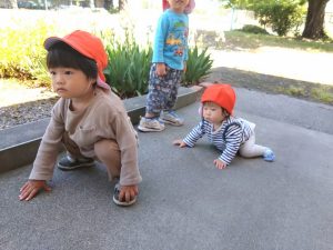 この日はもも組さんがハイハイをて登り降りをするのを見て、ハイハイレースが始まりました!!