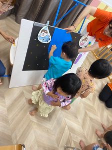 先生たちと楽しくお話ししながら飾り付けをし、完成!!