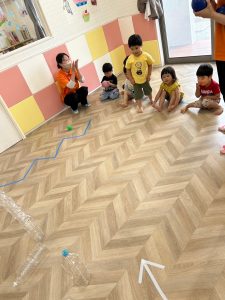 ペットボトルのピンが倒れると「イエーイ!!」とりんご組さんでは大盛り上がりでした😊