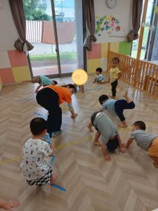 これは、動物になってみよう!くまさんや、蛇さんに変身して思い思いの動きを楽しんでいます😊