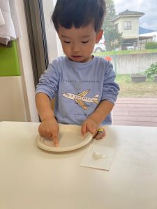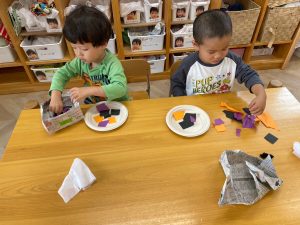 自分で破いた画用紙をどこに貼ろうか考えながら取り組むりんご組さん