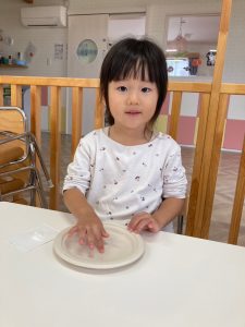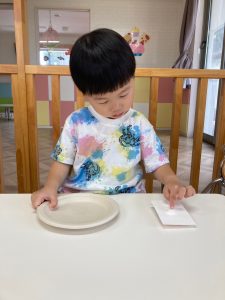 お皿に塗り終えたら、ビリビリ破いた画用紙を貼り付けました。