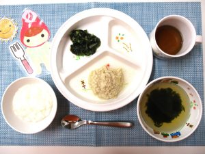(写真は離乳食後期です。年齢によって形、固さ、盛り付け量を変えて、提供しています。)