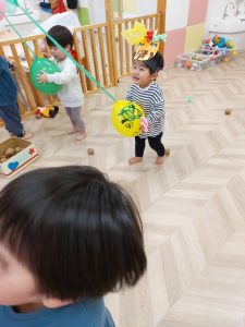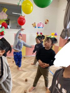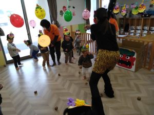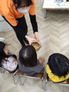 続いて、豆まき遊びをしました。