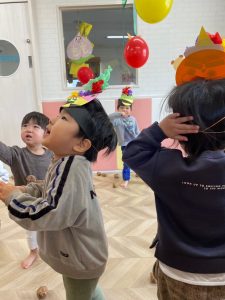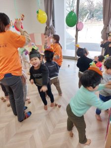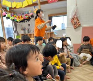 鬼のパンツや豆まきの歌を楽しみ、鬼のお面も作って鬼に親しんできた子ども達。