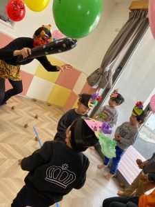 風船や板に描かれた鬼にお豆ボールをぶつけてやっつけます👹