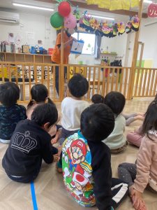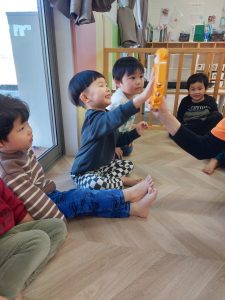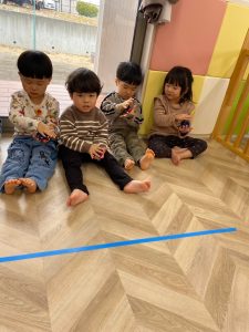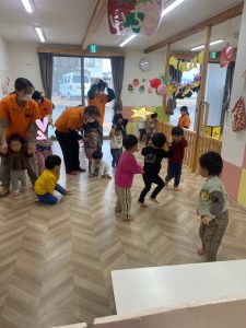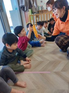 この日は、鬼に変身し、普通の鬼、可愛い鬼、大きくて強い鬼と、リズムや音の高低に耳を傾けて動きました🎶