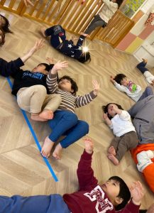 動き疲れたら、「きらきら星」の曲に合わせて床に寝そべってみます。