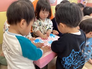 いちご、もも組から、もうすぐ卒園のりんご組さんへ一緒にたくさん遊んでくれてありがとうの意味を込め、手作りキーホルダーをプレゼント🎁