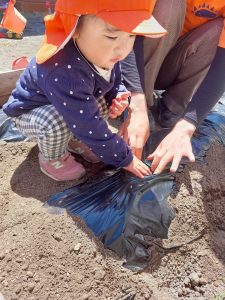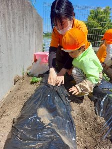 土を掘って苗を植えて、土のお布団をかけます