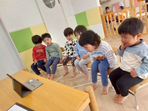 りんご組さんはタブレットを使用し、動画視聴を通して英語の学習をしています✏️