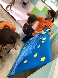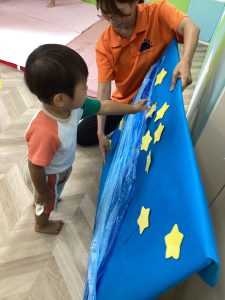 お部屋に散らばったお星様を探し天の川のパネルにペタッと貼り付けました