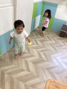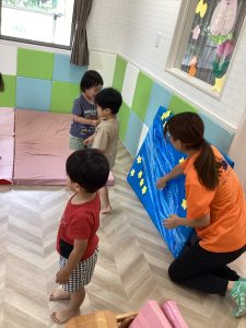 りんご組さんはちょっと難易度があがりマットの下や机の裏などあちこちに散らばっていましたが、張り切って探すことができました👀