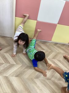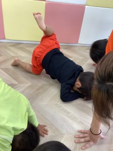 手をしっかりついて体勢がとれることも、後々前転する時や転んだ時に手が出てくれたら、顔から転ばないようになっていく練習にもなります♪