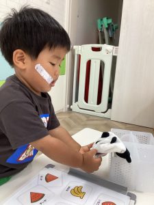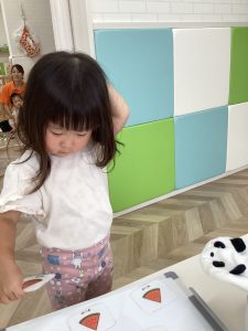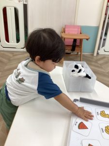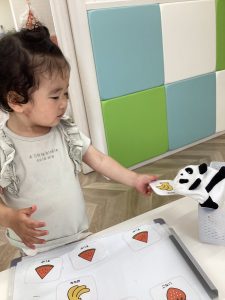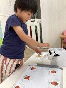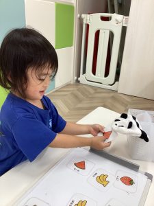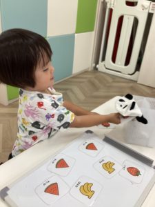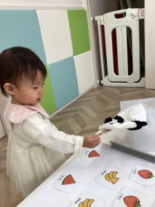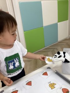 果物×数の英語を組み合わせた少し難しいゲームでしたが、単語をよ〜く聞きながら上手に食べさせることができました✨