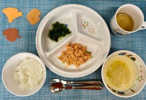 (写真は後期食です。離乳食は、離乳食の段階ごと固さ、切り方、量を変えて提供しています。)