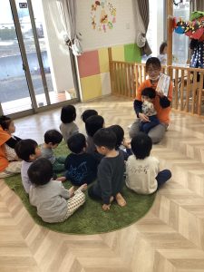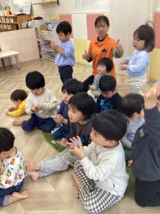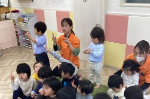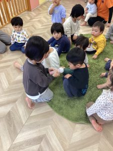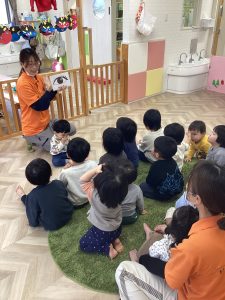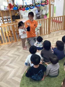 子どもたちが大好きな「finger family」の手遊びを、指人形をはめながら行いました♪