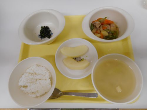 2018.05.01|給食ピックアップ 5月1日のメニュー? ・筑前煮 ・白みそ汁 ・ほうれん草のごま和え ・りんご 5月1日の離乳食(中期)メニュー? ・野菜のだし煮 ・ほうれん草のだし煮 ・おかゆ 前へ 次へ