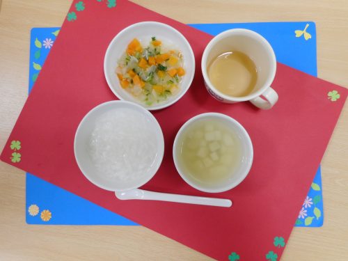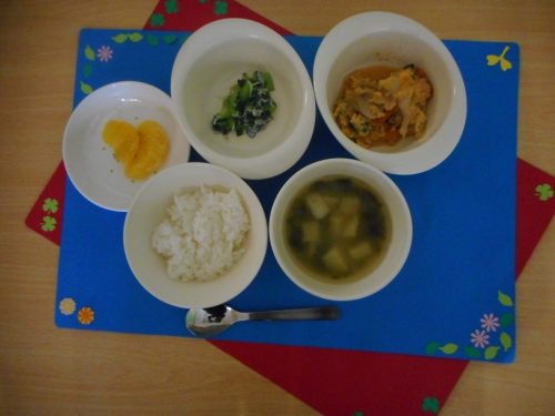 2018.05.10|給食ピックアップ 5月10日(木)のメニュー ・ごはん ・親子煮 ・じゃこ炒め ・ジャガイモのみそ汁 ・甘夏 5月10日(木)の離乳食メニュー(中期食) ・おかゆ ・しらす干しと野菜煮 ・豆腐のみそ汁 前へ 次へ