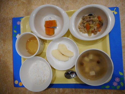 2018.05.23|給食ピックアップ 5月23日(水)のメニュー ・ごはん ・八宝野菜 ・南瓜煮付 ・豆腐のみそ汁 ・りんご 5月23日(水)の離乳食メニュー(初期食) ・おかゆ ・豆腐と野菜のだし煮 ・南瓜のだし煮 前へ 次へ