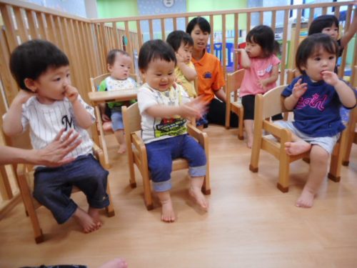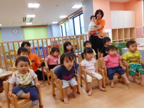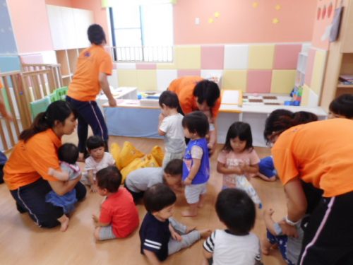 遊んでいた玩具を置いて保育室の真ん中に集まりました。