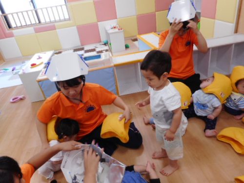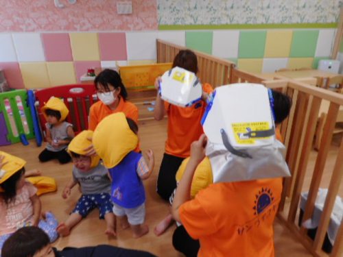 保育者も防災ヘルメットをかぶると・・・