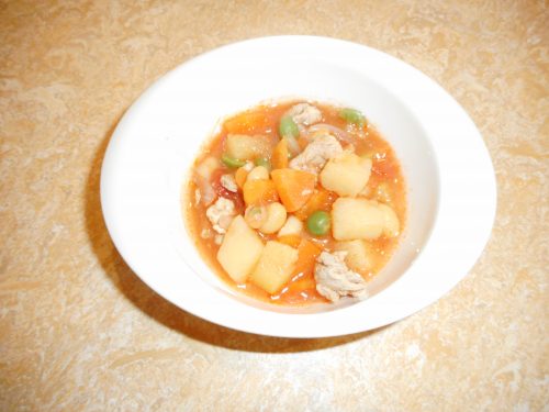 ①豚肉・たまねぎ・じゃがいも・にんじん・ズッキーニを炒める。