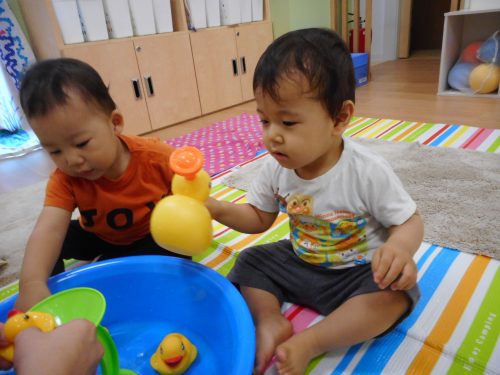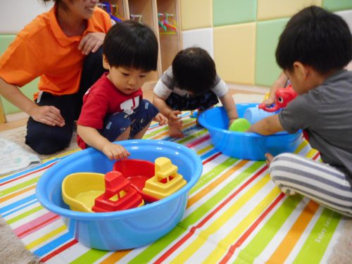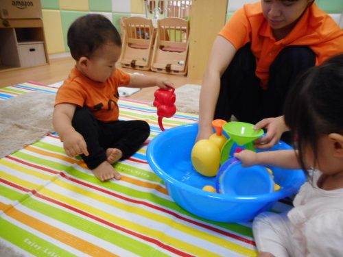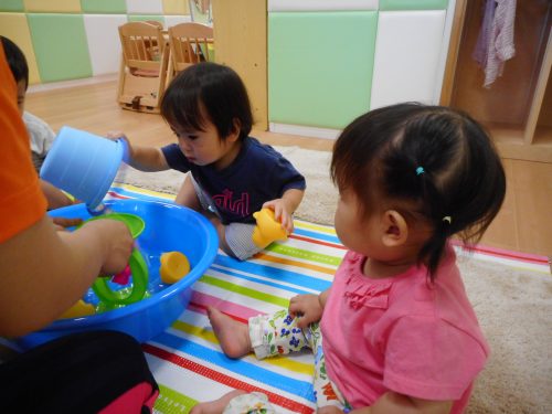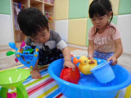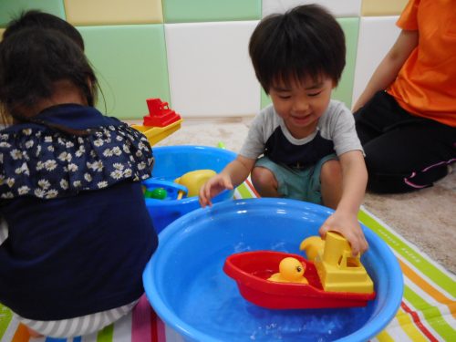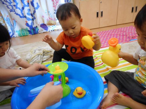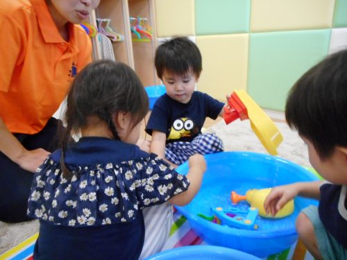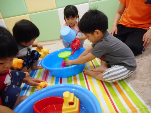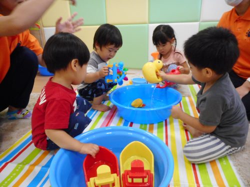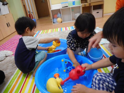 保育室内での水あそびですが、少しでも夏ならではの遊びを…