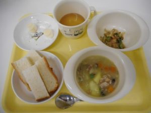 本日の給食メニュー ・ごはん ・チキンソテー ・含め煮 ・たまねぎのみそ汁 ・みかん缶 ...