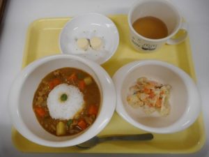 本日の給食メニュー ・ごはん ・カレーシチュー ・キャベツの胡麻ネーズ和え ・チーズ ...
