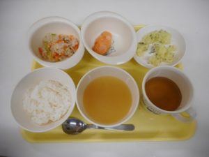 本日の給食メニュー ・ごはん ・鮭の塩焼き ・切干大根のサラダ ・粉ふき芋 ・たまねぎのみそ汁 &n...