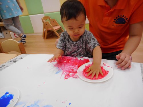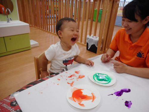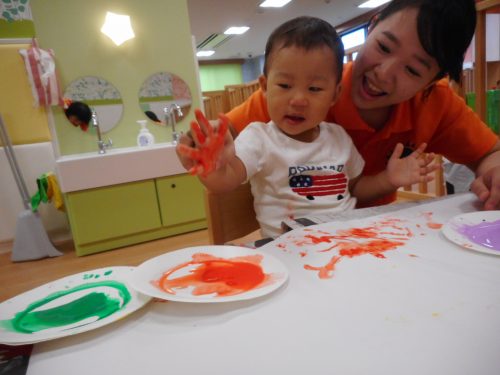 みどり・むらさき・オレンジの絵の具を使って指えのぐを