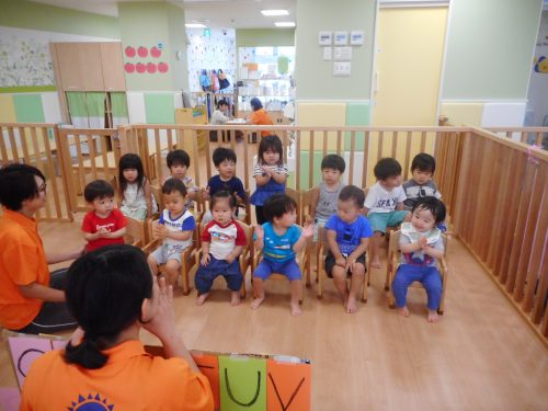 「ABCのうた」「大きなくりの木の下で」を英語の歌に合わせて身体を揺らしたり、手遊びを楽しんだり、