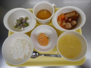 本日の給食メニュー ・ごはん ・みそ汁 ・照り焼きチキン ・ゆで野菜 ・ひじき炒り煮 ...