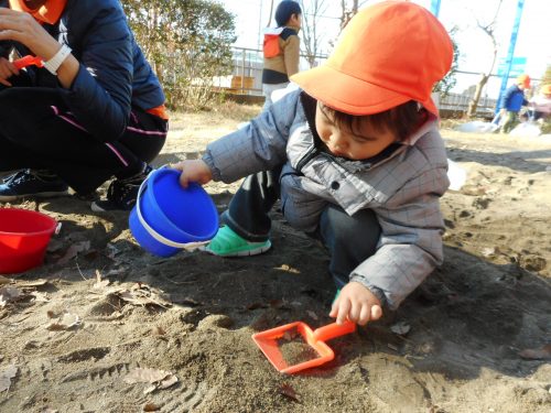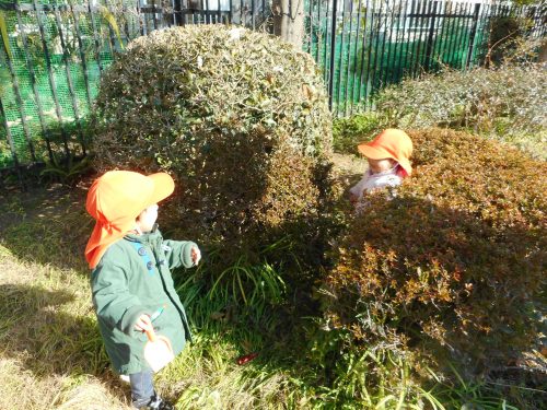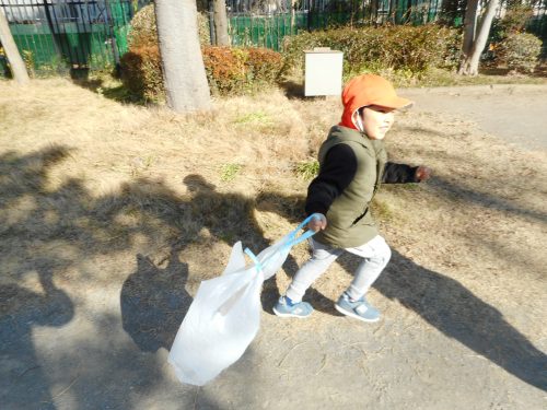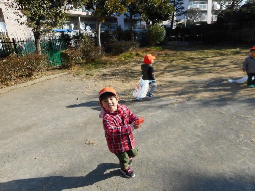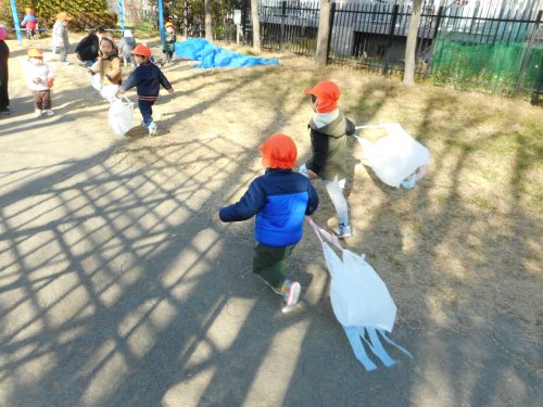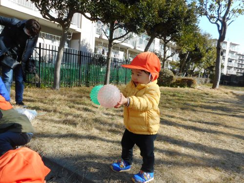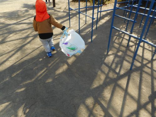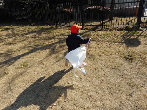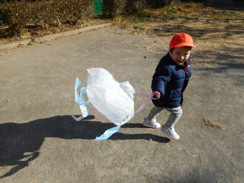 今週の2歳児さんは、自分たちで作った凧をなびかせに公園を