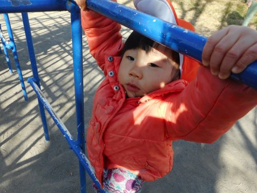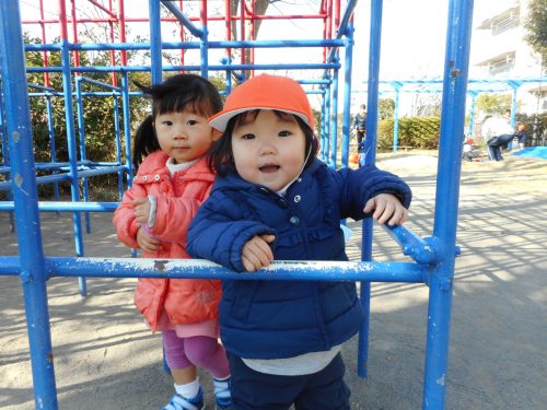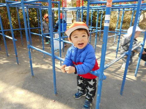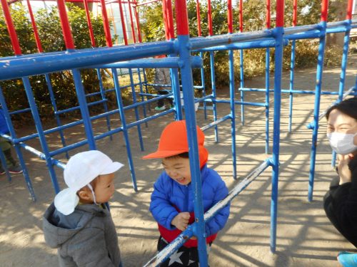 ジャングルジムをお家に見立ててお友だちと「ピンポーン」と、