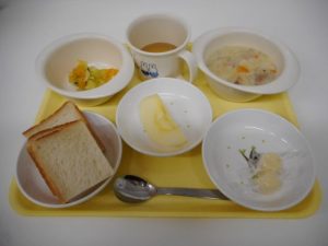 今日の給食メニュー ・食パン ・ホワイトシチュー ・フレンチサラダ ・チーズ ・りんご ...