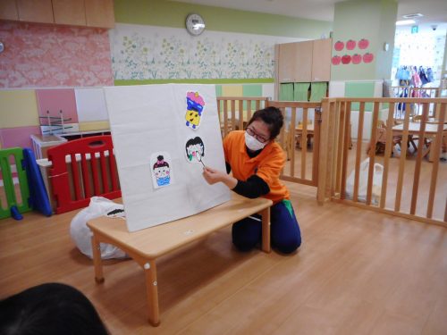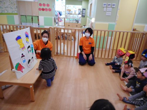パネルシアターでは、鬼の登場に、少し緊張する子供たち。