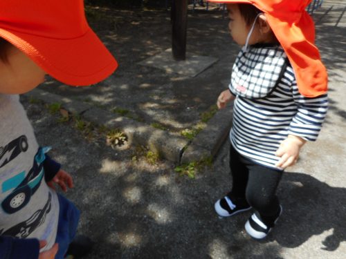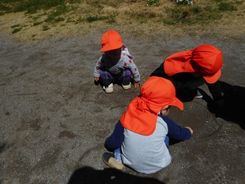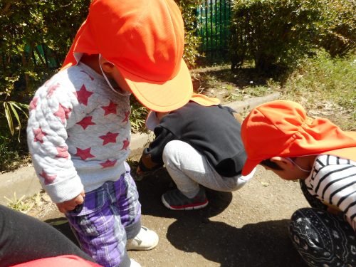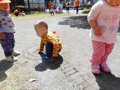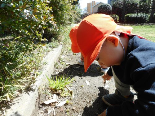 アリさんに夢中のお友だち。いつしかしゃがみ込んだりしながら