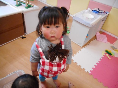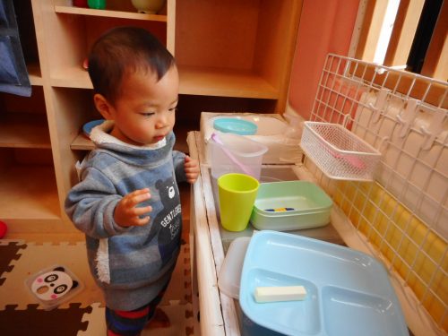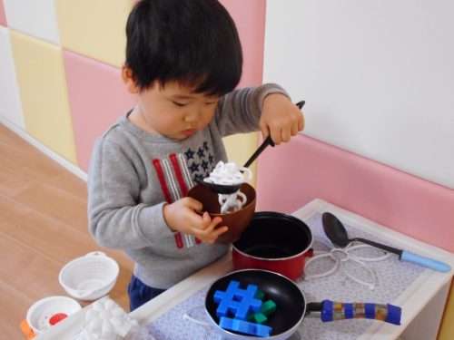 クラスのお部屋にあるおままごとコーナーでは、お料理作りに夢中です