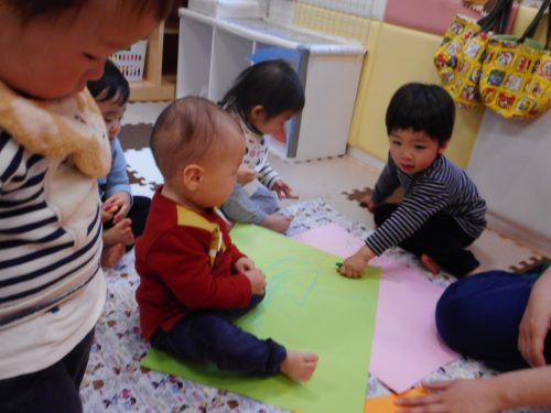 みんなで地面にアンパンマンの絵を描くのに夢中です