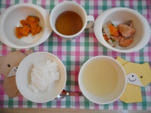 本日のお給食メニュー ・ごはん ・みそ汁 ・魚のから揚げ ・ポテトサラダ ・おかか和え