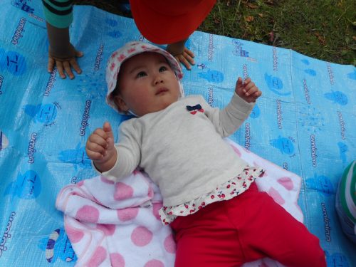 もも組さんがシートの上でコロンとしていると、「ねちゃったの?」
