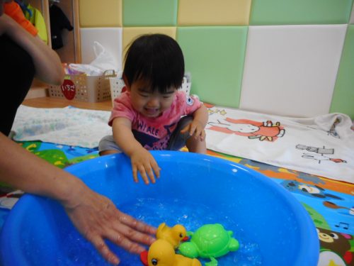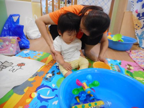 そして、今週はもも組さんが初めての水遊びを行いました![]()
