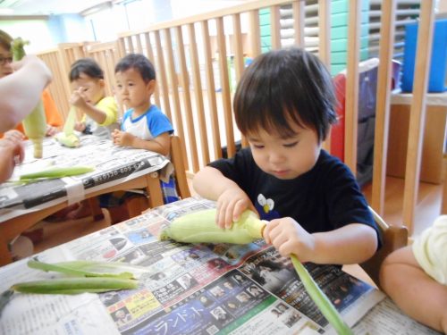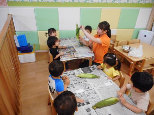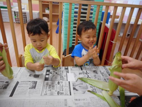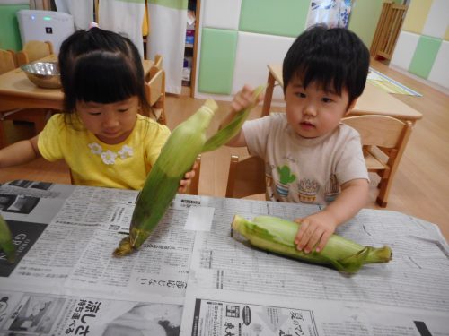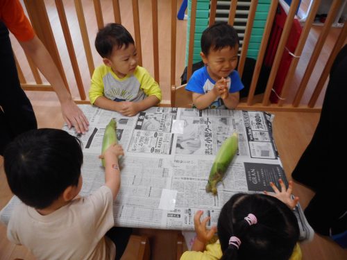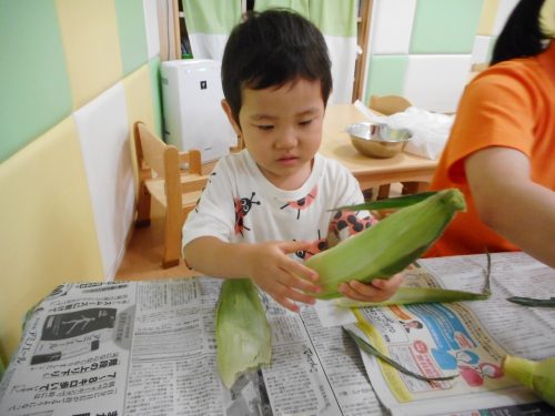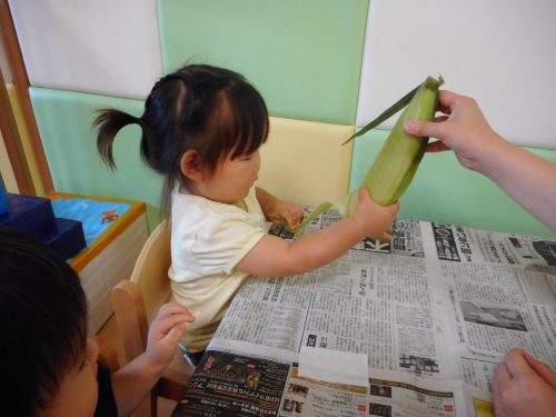 今週、りんご組さんはおやつに出てくるトウモロコシの皮むきに挑戦しました![]()