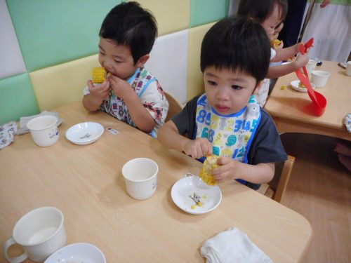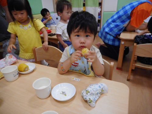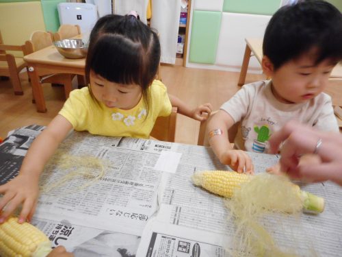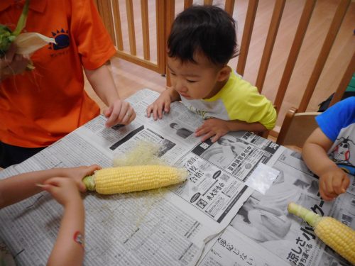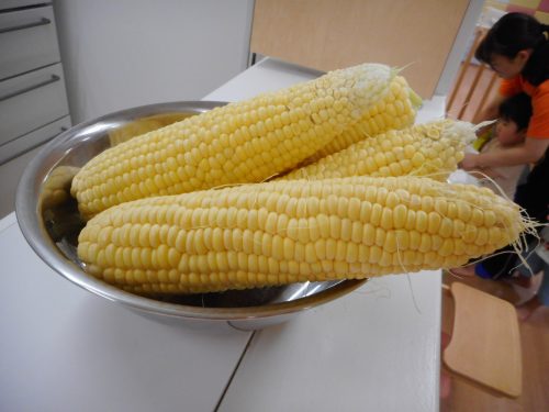 いちご組さんもりんご組さんが一生懸命にむいてくれたトウモロコシを
