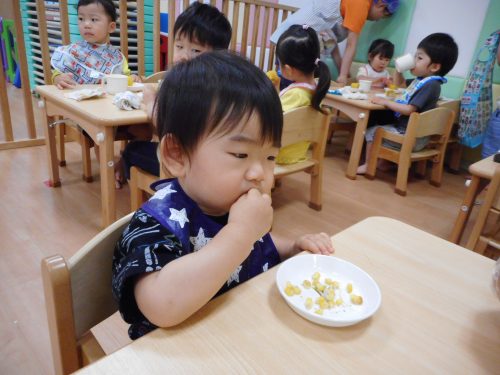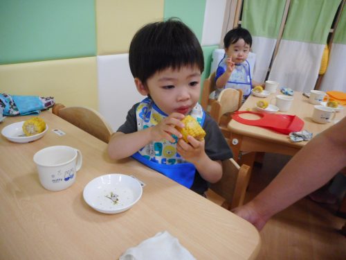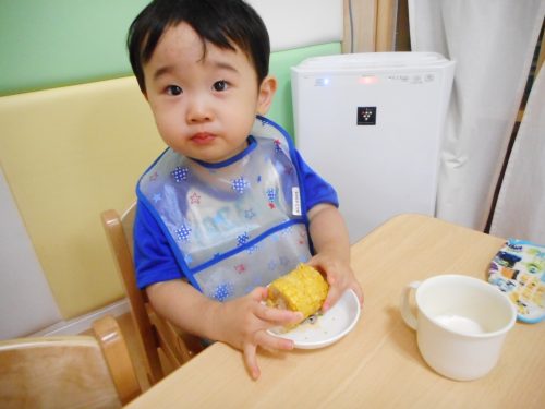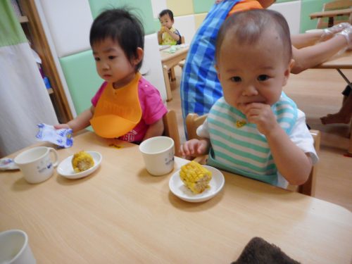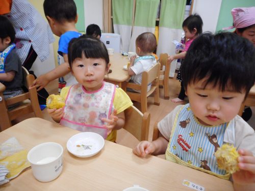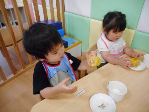 一生懸命皮むきしたトウモロコシがおやつに出ると、