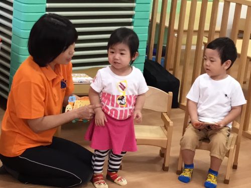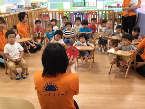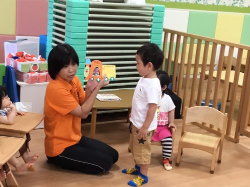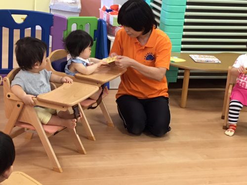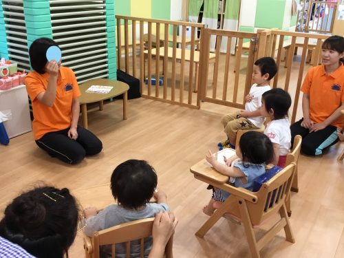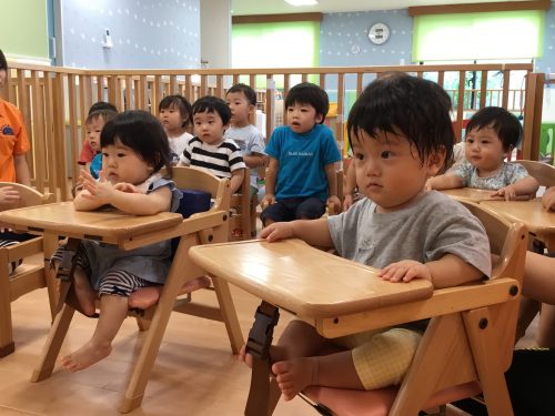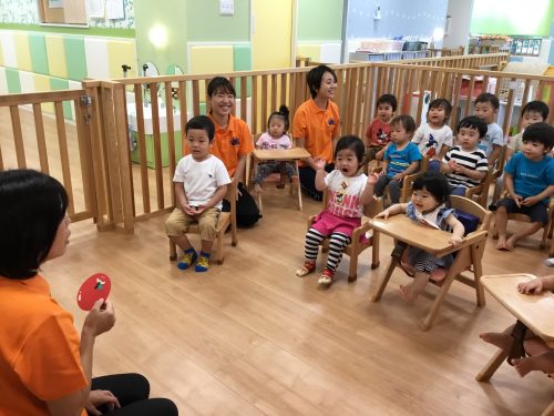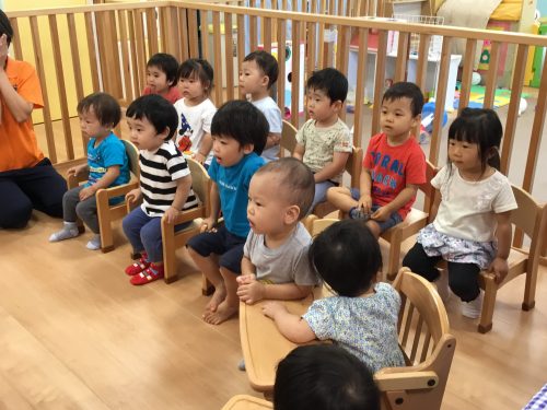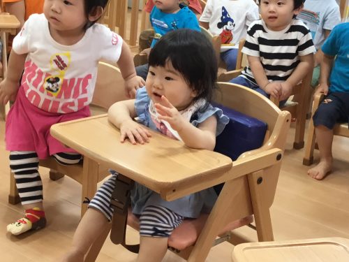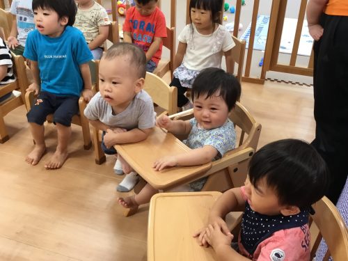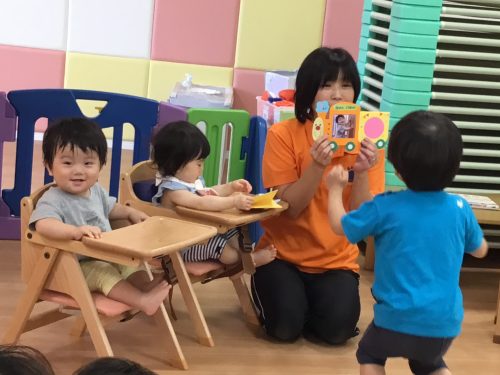 保育者の歌声に思わず笑顔になって可愛らしい笑い声も聞こえました。