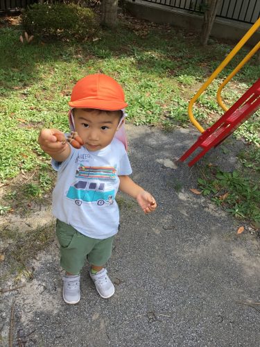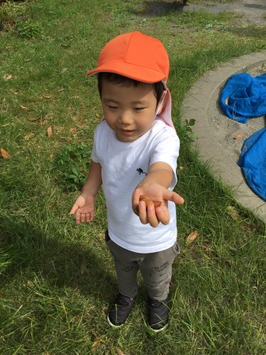 手のひらいっぱいにどんぐりを握りしめるお友だち![]()