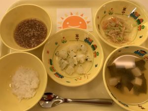 軟飯 味噌汁 そぼろ煮 粉ふき芋 ビーフンソテー